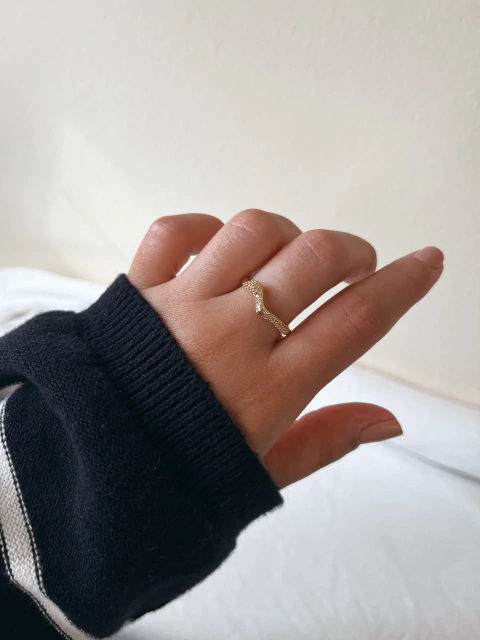 El Anillo Donia en acero dorado presenta un diseño irregular que lo hace único. Con detalles de micropavé, aporta un brillo sutil y sofisticado a cualquier atuendo. Este anillo es perfecto para quienes desean destacar sin perder la elegancia.
