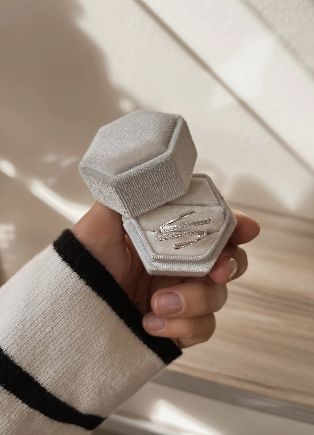 Anillo en acero blanco con un diseño moderno y estilizado de líneas entrecruzadas, realzadas con delicados cúbics que aportan brillo y sofisticación. Una pieza elegante y contemporánea, ideal para quienes buscan un accesorio versátil con un toque de distinción.