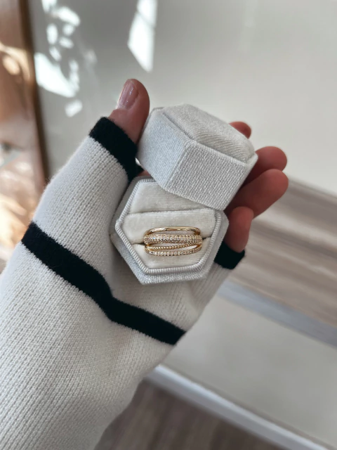 Audaz y sofisticado, el Anillo Valenne se destaca por su diseño ancho compuesto por tiras alternadas: algunas facetadas que capturan la luz y otras con micropavé que aportan un brillo delicado. Una pieza en acero dorado con presencia y estilo propio, ideal para quienes buscan elegancia con un toque original.