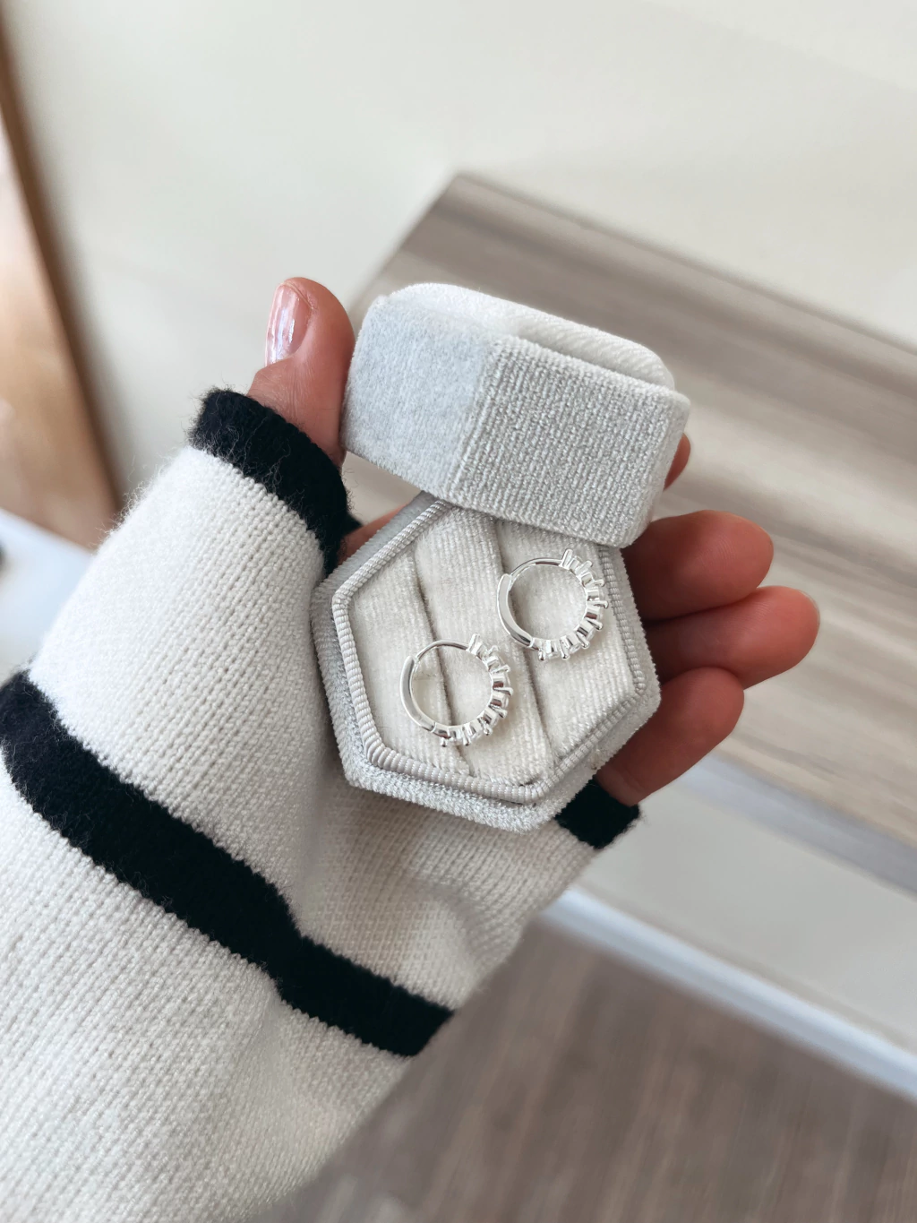 Delicadas argollas de plata 925 con cierre clic, cómodas y seguras para el uso diario. Están sutilmente adornadas con pequeños cúbics que aportan un brillo elegante y discreto, ideales para lucir solas o combinadas con otras piezas. Perfectas para un estilo femenino, moderno y versátil.