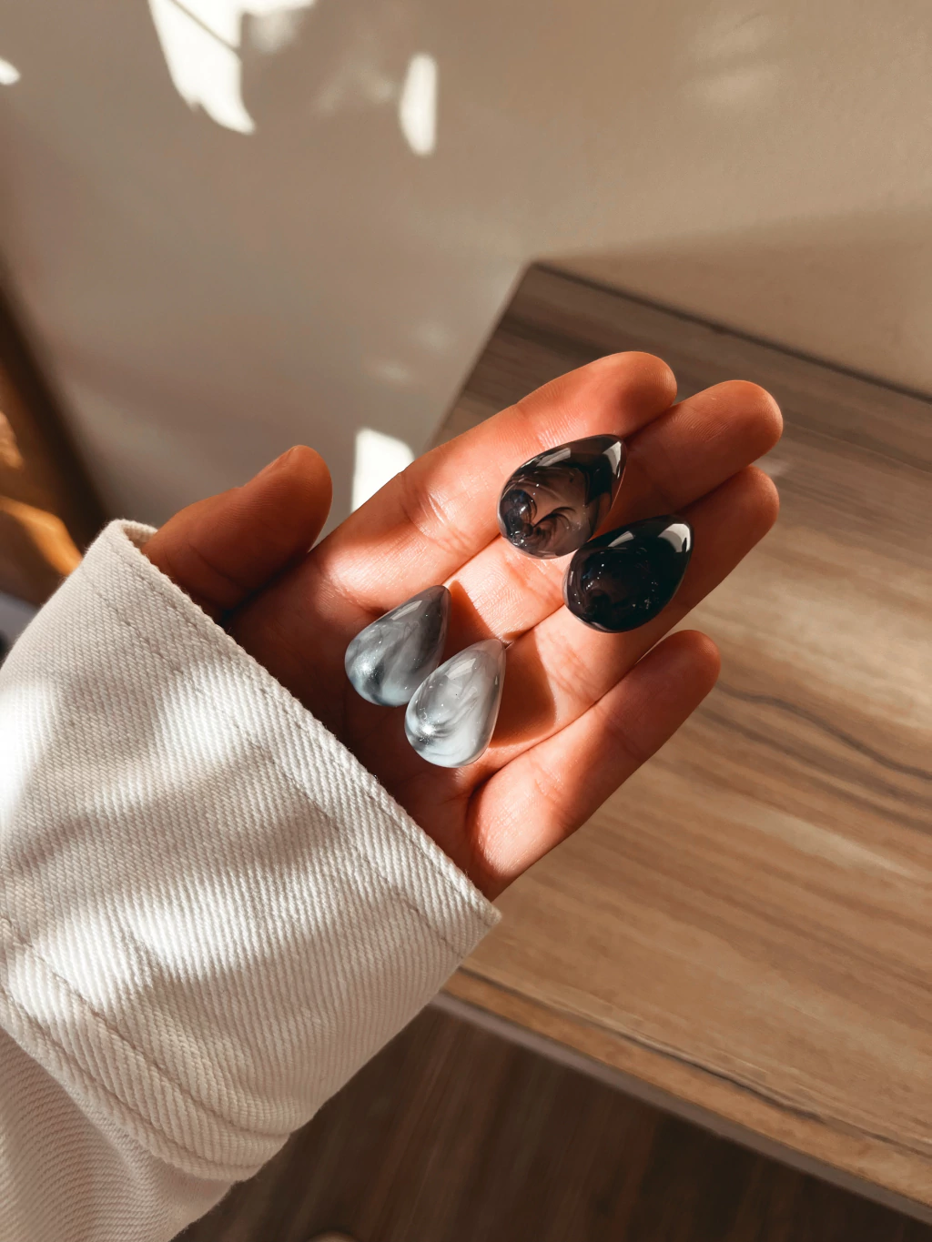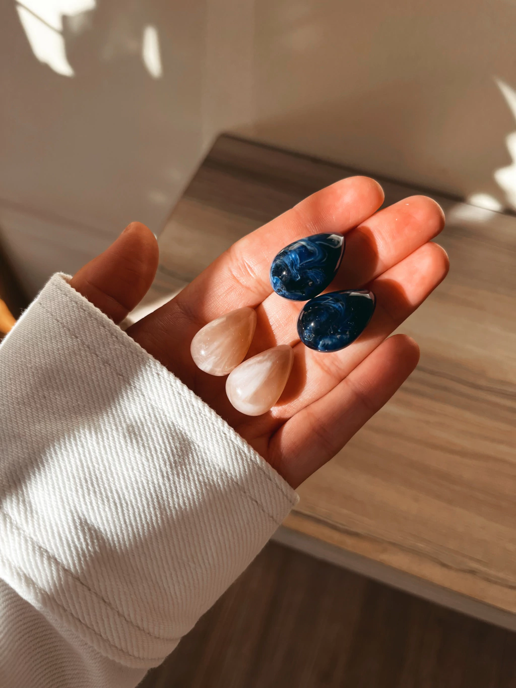 Aros Lunaris en acero quirúrgico con diseño de media argolla en resina efecto nácar, ligeros y con un brillo suave que aporta un toque delicado y moderno. Disponible en varios colores.