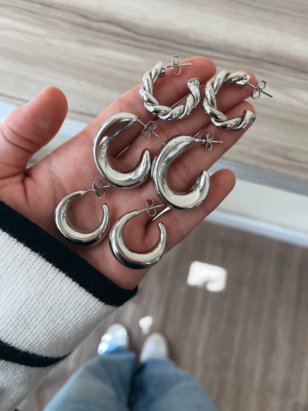 Modernas medias argollas en acero quirúrgico con cierre mariposa, resistentes e hipoalergénicas. Su diseño ancho y acabado brillante aporta un estilo elegante y versátil, ideal para complementar tanto looks casuales como más sofisticados. Una pieza atemporal que no puede faltar en tu colección.