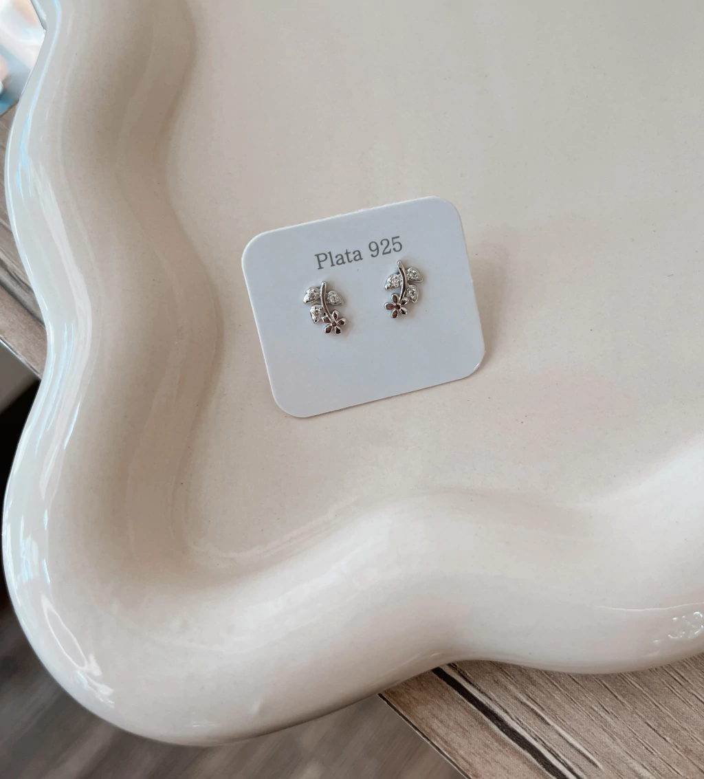 Aros en Plata 925 con baño de rodio y diseño de ramita con hojitas y flor ✨