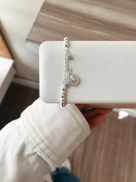 Pulsera en acero blanco con bolitas y dije de gota con cubic: Elegante pulsera confeccionada en acero blanco, con diseño de bolitas que le aporta textura y delicadeza. Cuenta con un dije central en forma de gota, engarzado con un cubic que refleja la luz de manera sutil. Es regulable, adaptándose cómodamente a cualquier muñeca, ideal para llevar sola o combinar con otras pulseras.