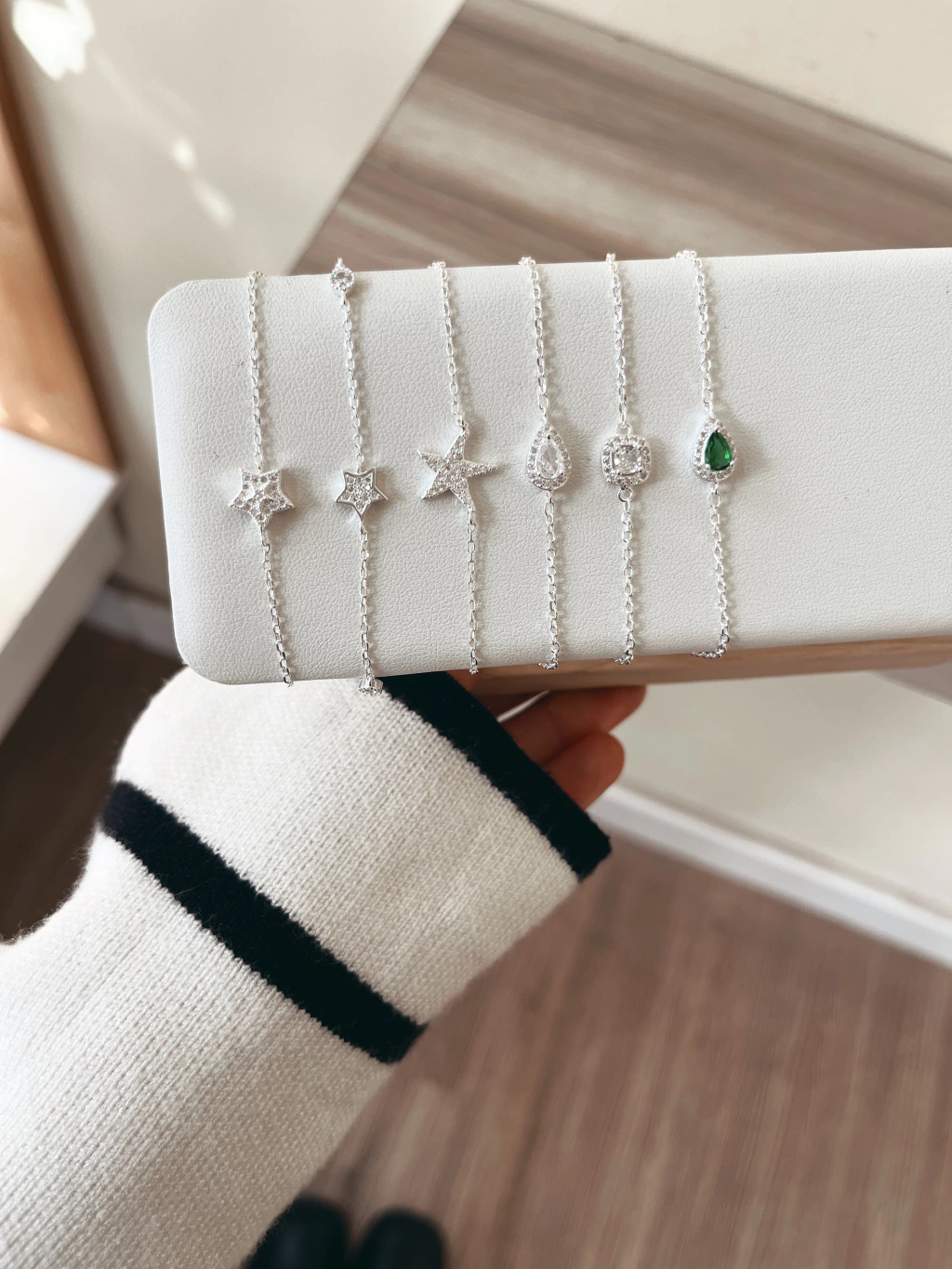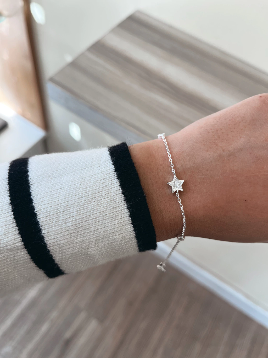 Delicada y fina pulsera en plata 925, regulable para un ajuste perfecto. Su pequeño dije central en forma de estrella aporta un toque de brillo y elegancia, ideal para lucir sola o combinada con otras pulseras.