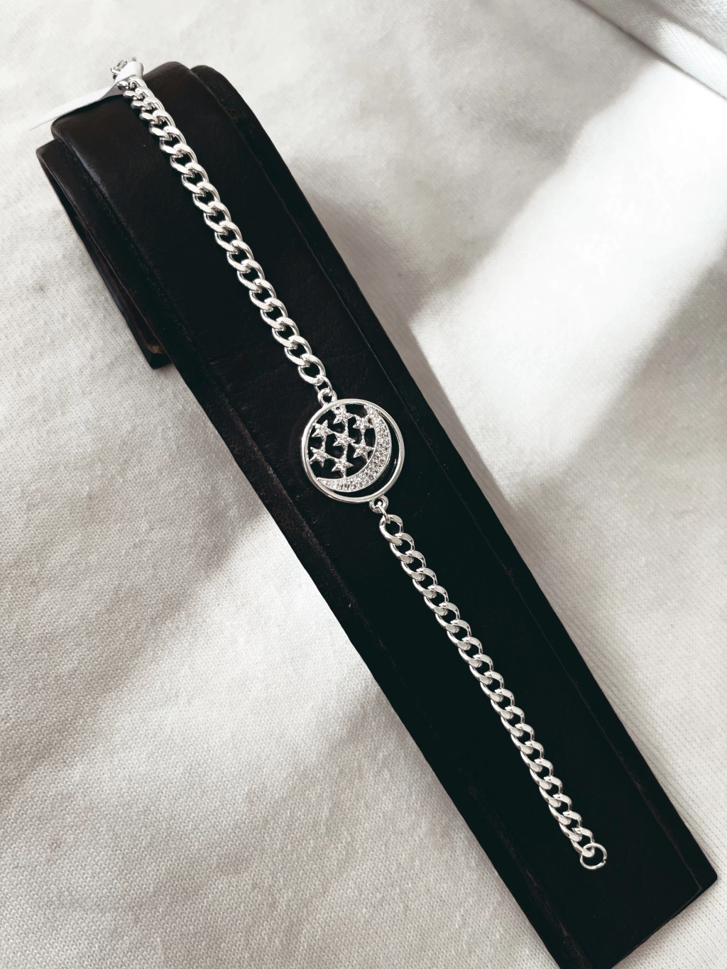 La Pulsera Cinzia es una pieza única que combina la belleza de un dije central de luna y estrellas con un elegante diseño en acero blanco. Con un largo de 17 cm, esta pulsera se adapta a diversas muñecas, brindando un ajuste cómodo y seguro.