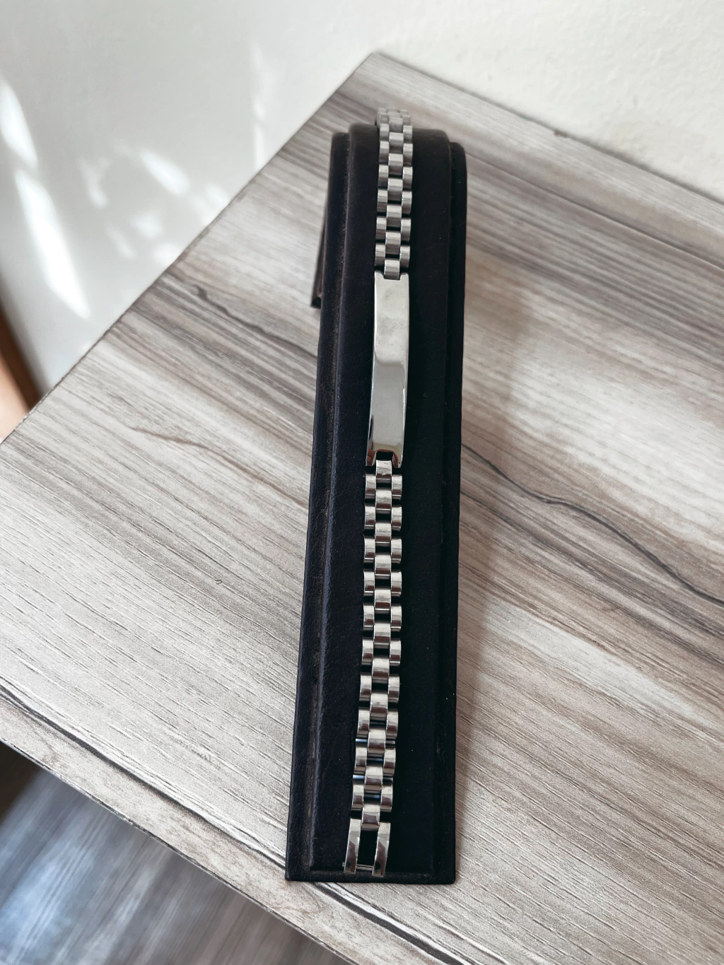 Pulsera de identidad de 21 cm en acero quirúrgico con diseño Rolex: elegancia y resistencia en una pieza clásica y sofisticada. Ideal para grabado personalizado y perfecta para un estilo distintivo que nunca pasa de moda.