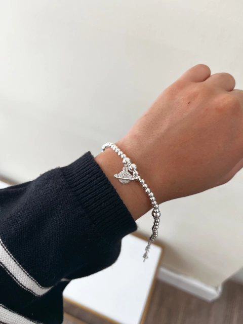 Descubre nuestra pulsera con bolitas y dije de planeta colgante en el centro, confeccionada en acero blanco de alta calidad. Con un tamaño de 17 cm regulable hasta 20 cm, se adapta a tu muñeca con facilidad, brindando comodidad y estilo. Su diseño elegante es perfecto para cualquier ocasión, realzando tu look con un toque moderno.