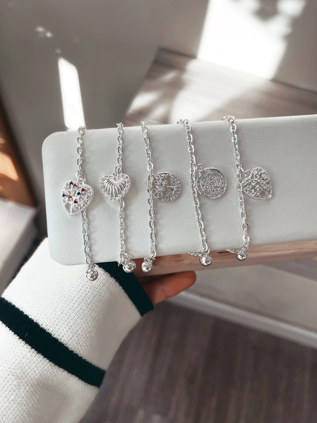 Pulsera Veloria en acero blanco – Elegancia y brillo en una pieza delicada de 19 cm, con dije de corazón colgante adornado con micropavé. Un diseño sutil y femenino, ideal para complementar cualquier look con un toque de luz y estilo.